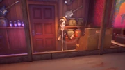 While on his way up to meet Dottie, he finds a bowl of Blackberry Joy that he mistakes for "party favours", as he consumes them it triggers a nasty episode of extreme, surreal and trippy hallucinations through distroted corridors, masks that whisper nonsense and is constantly being chased by flaming elevator doors with sharp teeth.