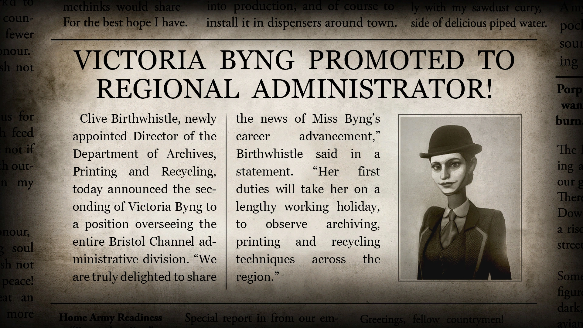 Clive Birtwhistle, newly appointed Director of the Department of Archives, Printing and Recycling, today announced the seconding of Victoria Byng to a position overseeing the entire Bristol Channel administrative division. "We are truly delighted to share the news of Miss Byng's career advancement," Birtwistle said in a statement. "Her first duties will take her on a lengthy working holiday, to observe archiving, printing and recycling techniques across the region."