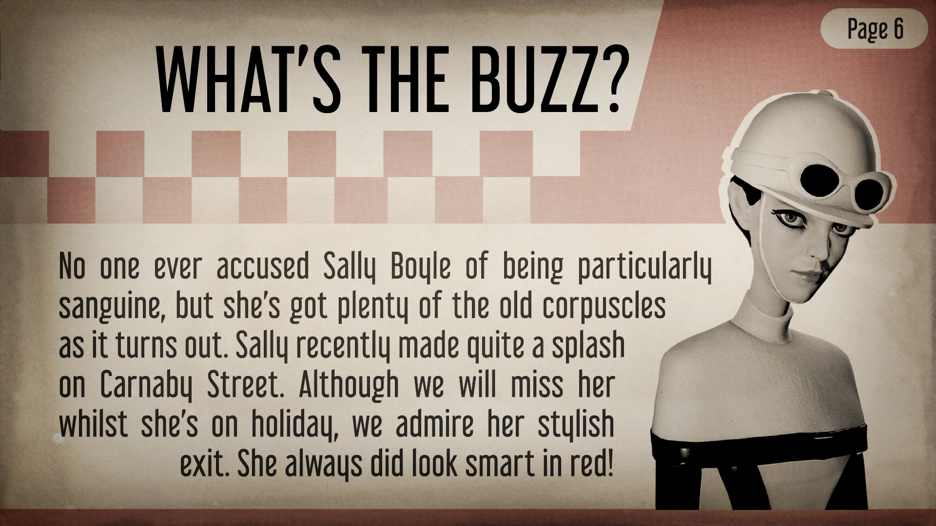 "No one accused Sally Boyle of being particularly sanguine, but she's got plenty of the old corpuscles as it turns out. Sally recently made quite a splash on Carnaby Street. Although we will miss her whilst she's on holiday, we admire her stylish exit. She always did look smart in red!"
