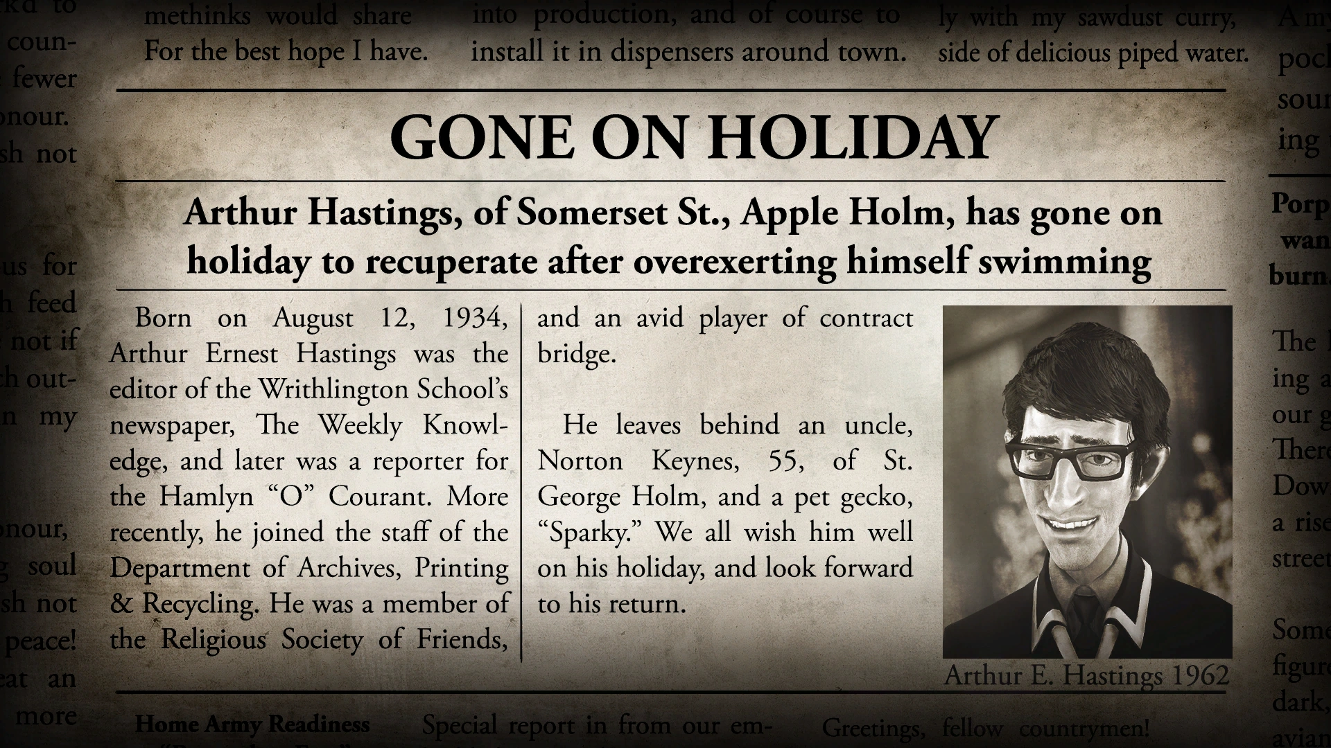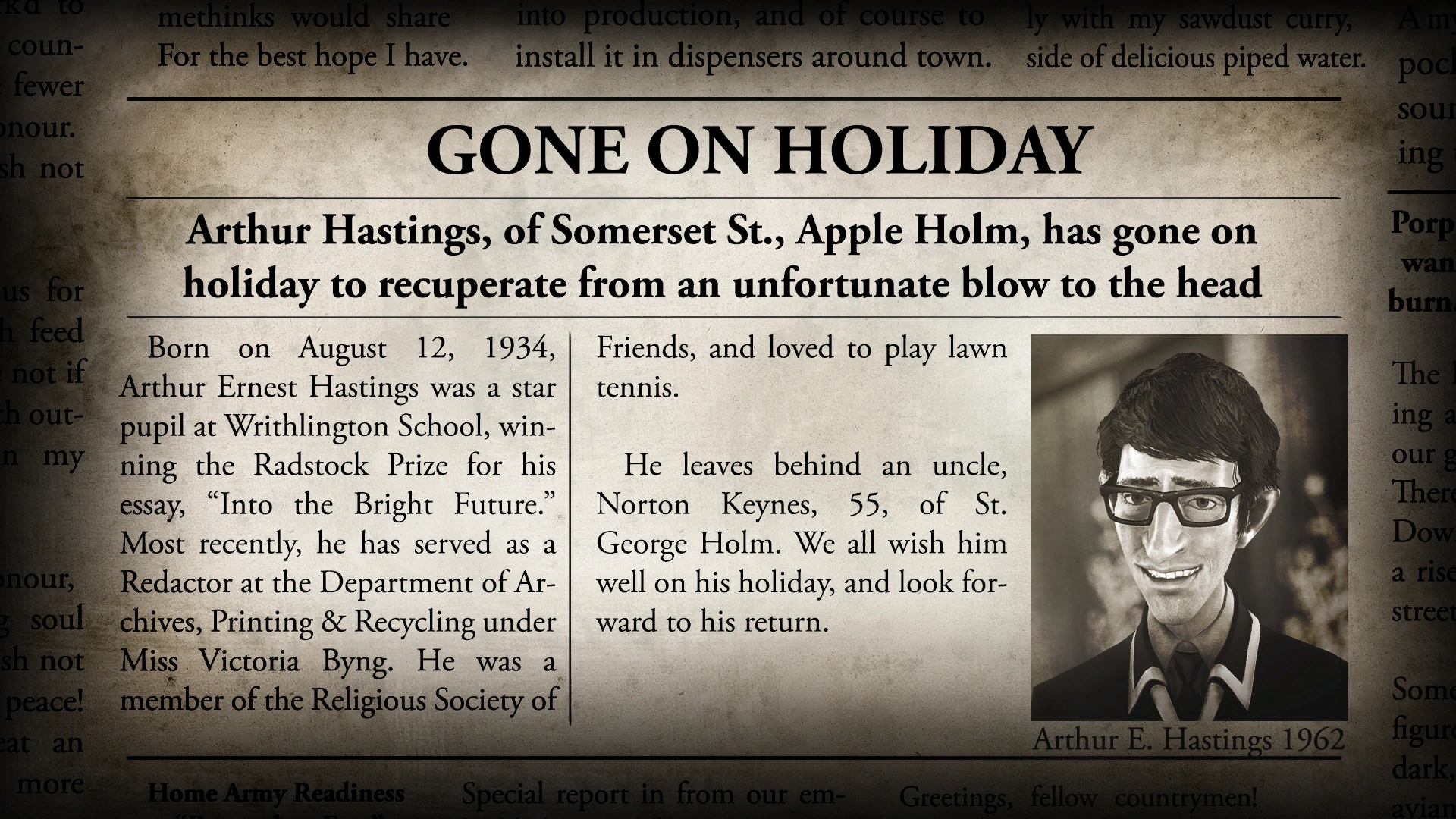 "Born on August 12, 1934, Arthur Ernest Hastings was a star pupil at Writhlington School, winning the Radstock Prize for his essay, "Into the Bright Future." Most recently, he has served as Redactor at the Department of Archives, Printing & Recycling under Miss Victoria Byng. He was a member of the Religious Society of Friends, and loved to play lawn tennis.