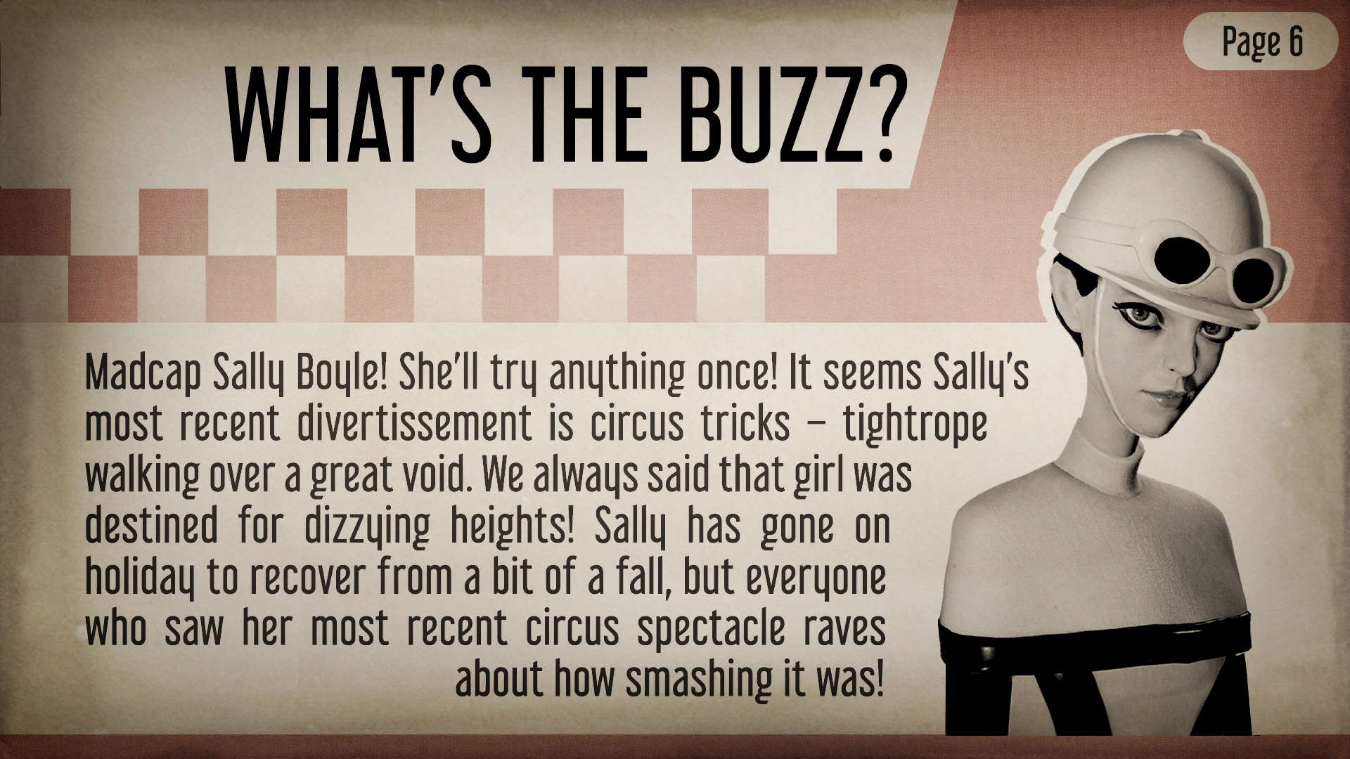 "Madcap Sally Boyle! She'll try anything once! It seems Sally's most recent divertissement is circus tricks - tightrope walking over a great void. We always said that girl was destined for dizzying heights! Sally has gone on holiday to recover from a bit of a fall, but everyone who saw her most recent circus spectacle raves about how smashing it was!"