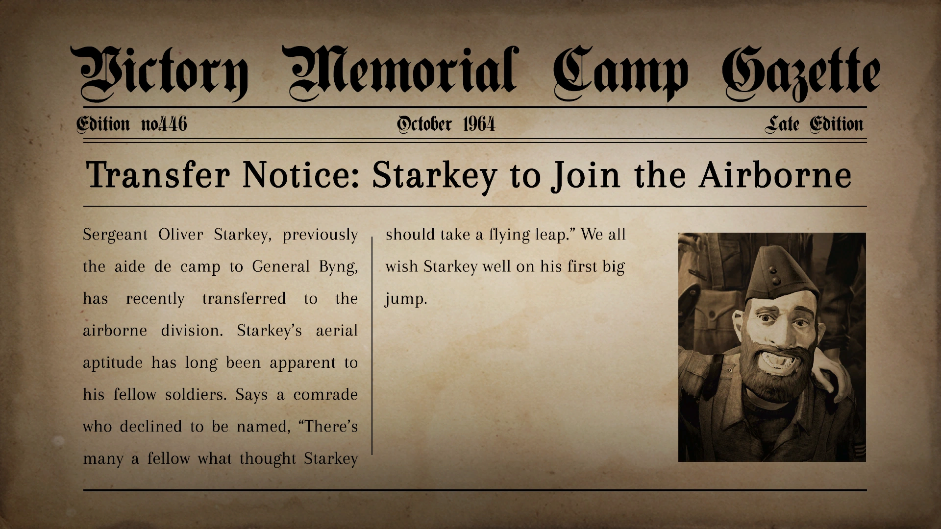 "Sergeant Oliver Starkey, previously the aide de camp to General Byng, has recently been transferred to the airborne division. Starkey's aerial aptitude has long been apparent to his fellow soldiers. Says a comrade who declined to be named, "There's many a fellow what thought Starkey should take a flying leap." We all wish Starkey well on his first big jump."