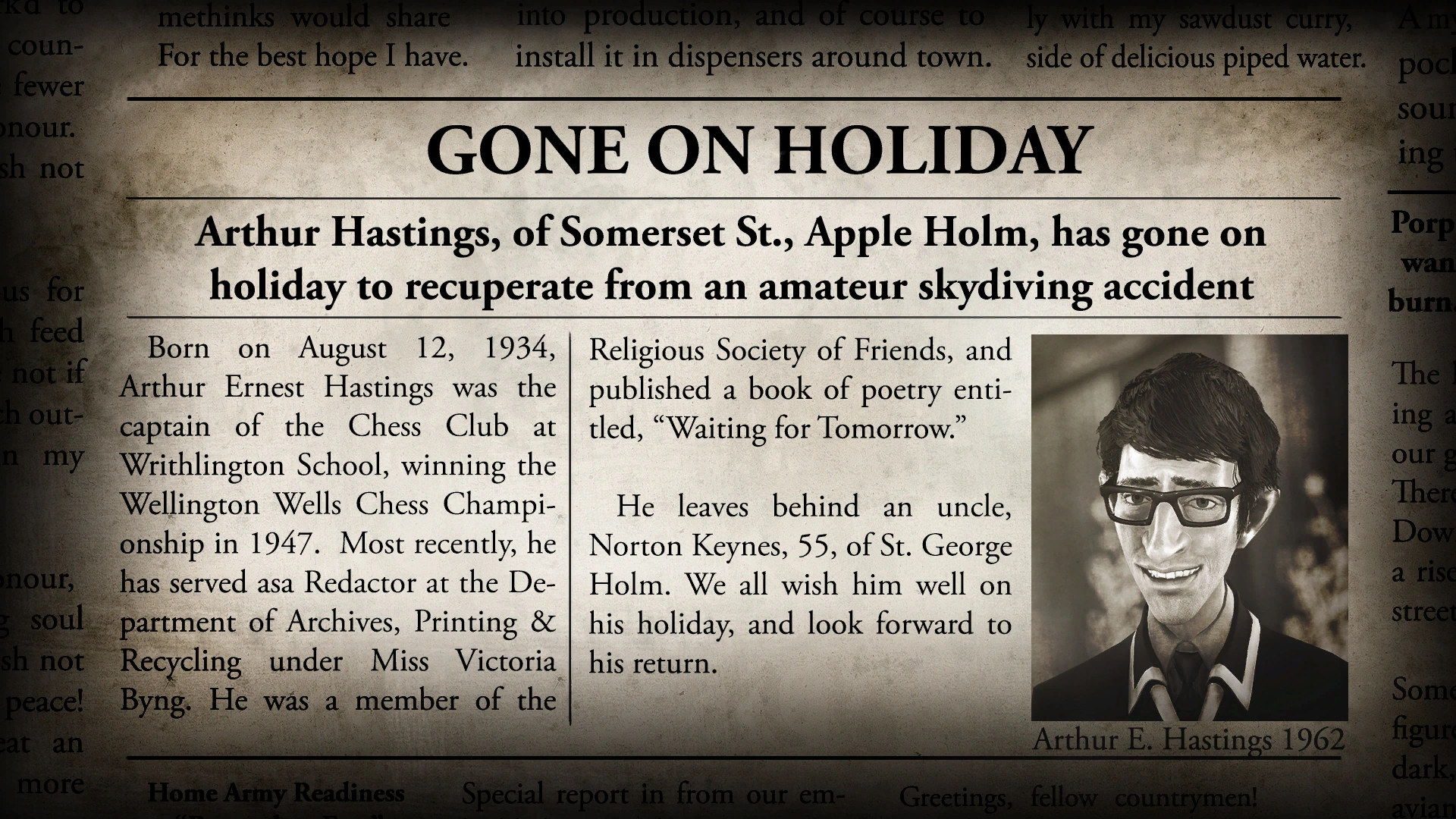 "Born on August 12, 1934, Arthur Ernest Hastings was the captain of the Chess Club at Writhlington School, winning the Wellington Wells Chess Championship in 1947. Most recently, he has served as Redactor at the Department of Archives, Printing & Recycling under Miss Victoria Byng. He was a member of the Religious Society of Friends, and published a book of poetry entitled, "Waiting for Tomorrow."