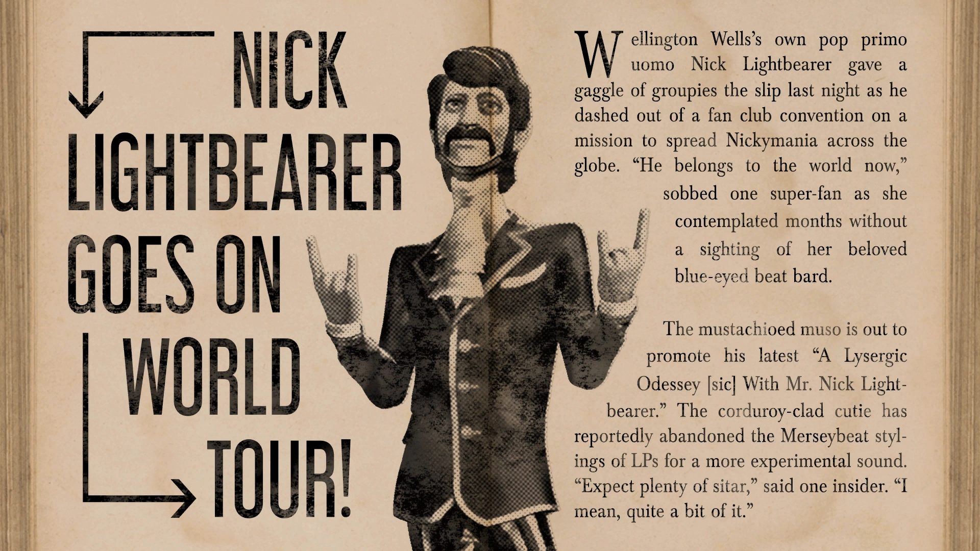 The mustachioed muso is out to promote his latest "A Lysergic Odessey [sic] With Mr. Nick Lightbearer." The corduroy-clad cutie has reportedly abandoned the Merseybeat stylings of LPs for a more experimental sound. "Expect plenty of sitar," said one insider. "I mean, quite a bit of it."