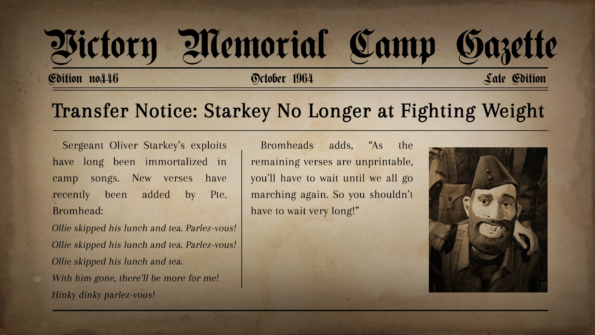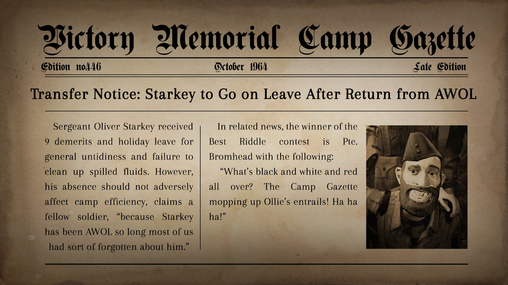 "Sergeant Oliver Starkey received 9 demerits and holiday leave for general untidiness and failure to clean up spilled fluids. However, his absence should not adversely affect camp efficiency, claims a fellow soldier, "because Starkey has been AWOL so long most of us had sort of forgotten about him." In related news, the winner of the Best Riddle contest is Pte. Bromhead with the following: "What's black and white and red all over? The Camp Gazette mopping up Ollie's entrails! Ha ha ha!"