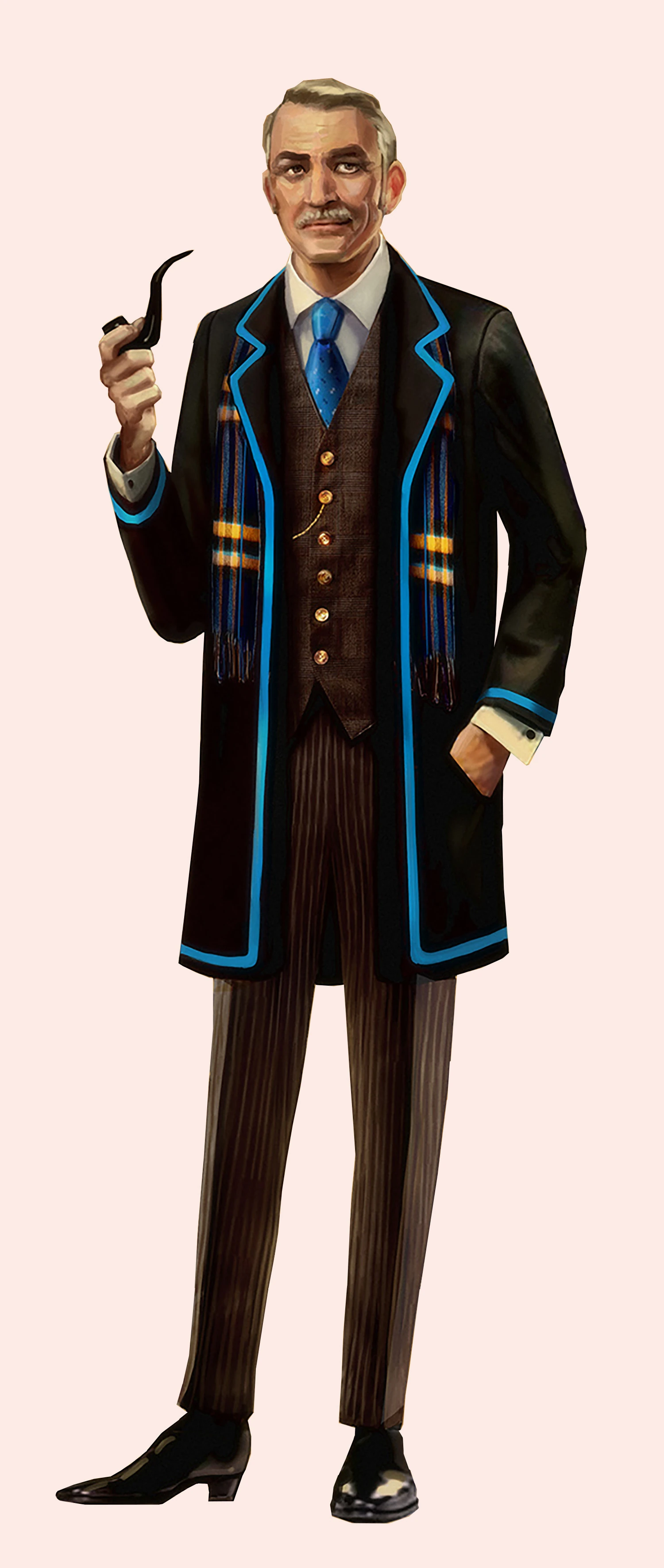 Robert Byng is an old man with white parted hair, moustache, and blue eyes. He wears a dark brown suit with matching shoes, a white button shirt underneath, and a long black jacket with blue rims around the edges.
